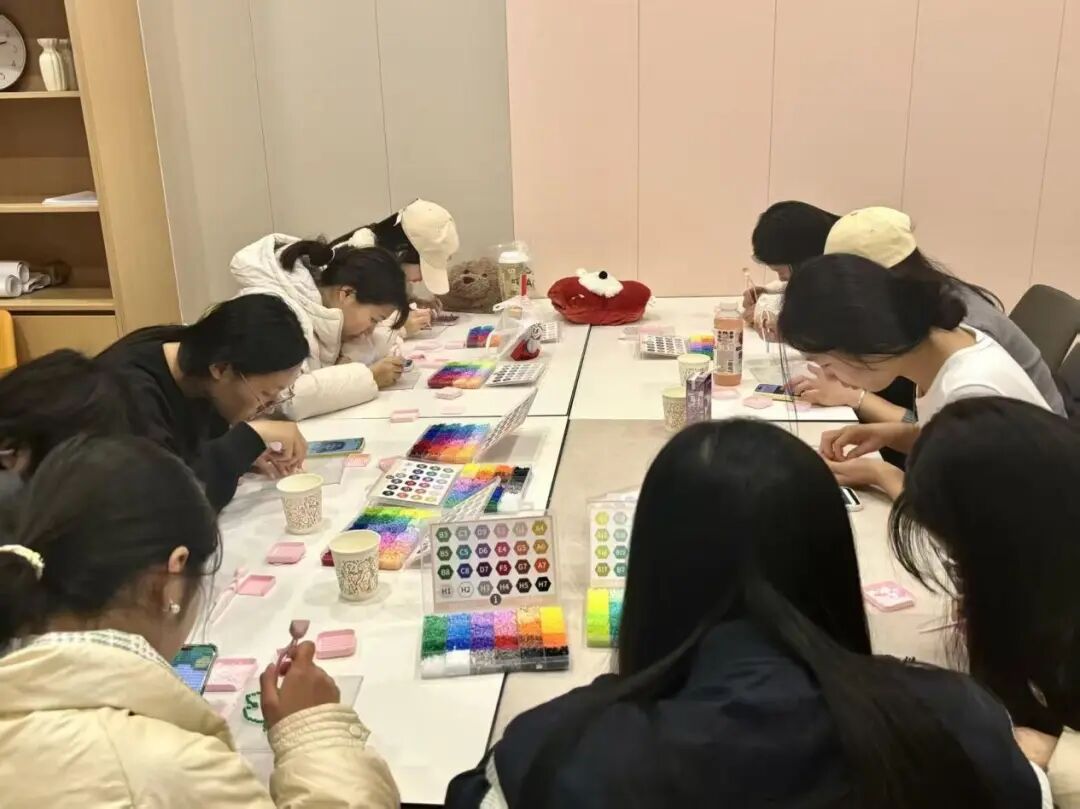 活动一经发布便得到同学们的积极响应,按照报名顺序,前八名同学参与到了活动中。工作人员提前精心布置场地,柔和的灯光、整齐摆放的拼豆材料与工具,让现场充满温馨感,为活动的顺利开展奠定了良好基础。